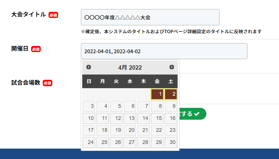 | 開催日 (必須) | 入力欄を選択するとカレンダーが起動しますので、開催日を選択してください。 開催日が複数ある場合は、カレンダーで該当の日を複数選択してください。 年月日がカンマ区切りで自動で入力されます。 例) 2022-06-01, 2022-06-02 |