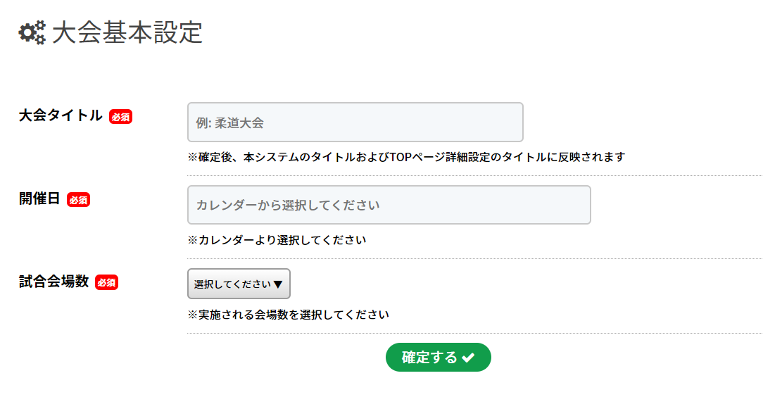 | 試合会場数 (必須) | 会場で実施される試合場の数をプルダウンより選択してください。 |