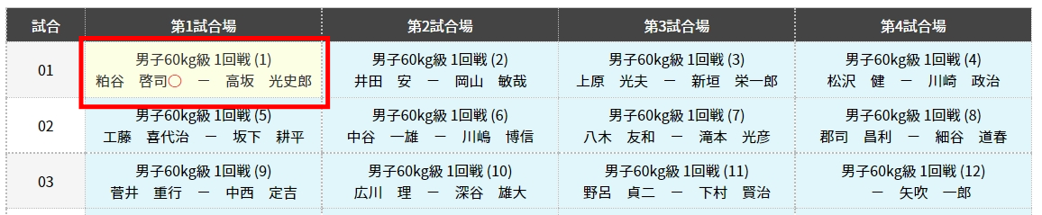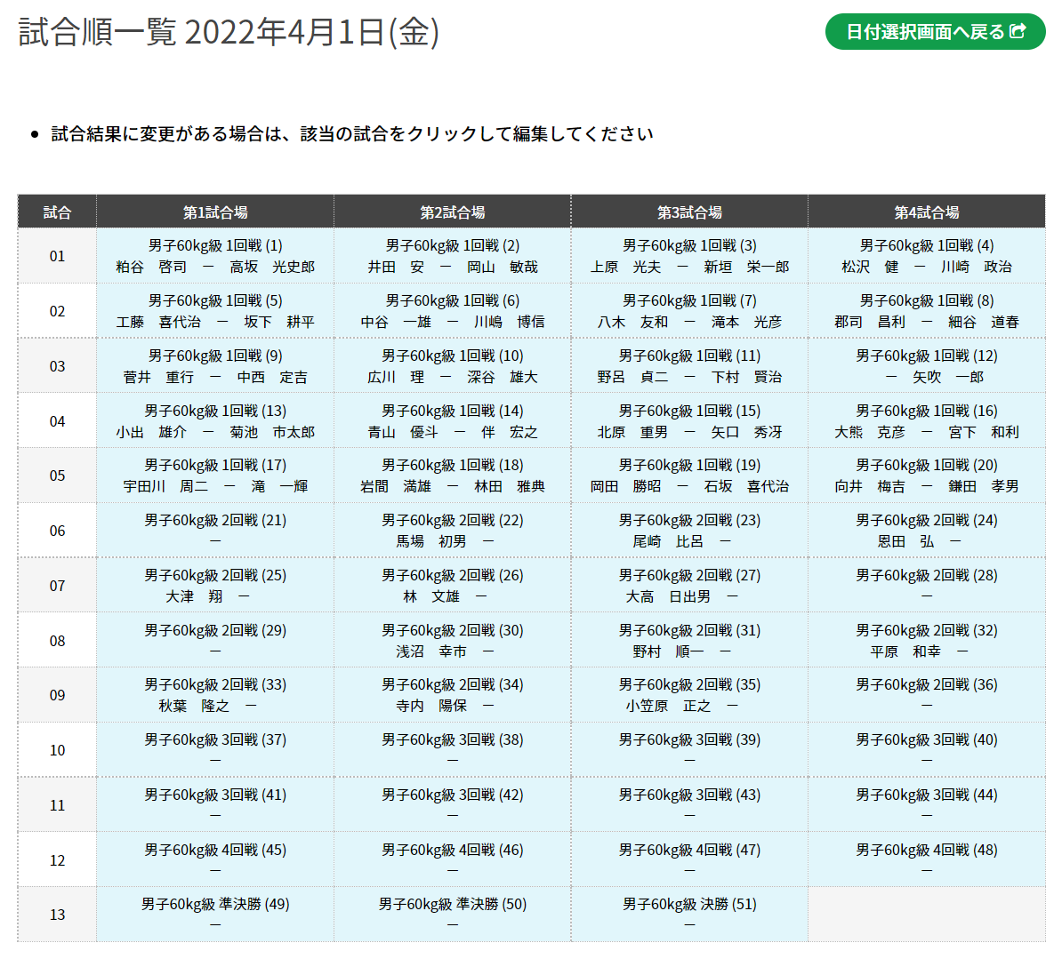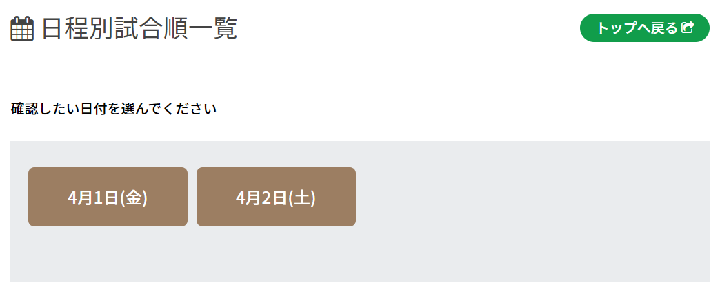10日別試合順一覧 UPDATE 2022.02.27 日別で、試合場ごとの試合順一覧表を閲覧・試合結果の編集することができます。 Menuより「日別試合順一覧」を選択します。下図のように日別のボタンが表示されますので、任意のボタンを選択してください。 下図のように、試合順一覧の表を確認できます。下図のサンプルでは、2022年4月1日(金)の第1~4試合場の試合を表示しており、左列の「試合」が試合順になります。 既に終了した試合は、下図のように試合結果が表示され選択できるようになります。選択することで、試合内容を編集することもできます。