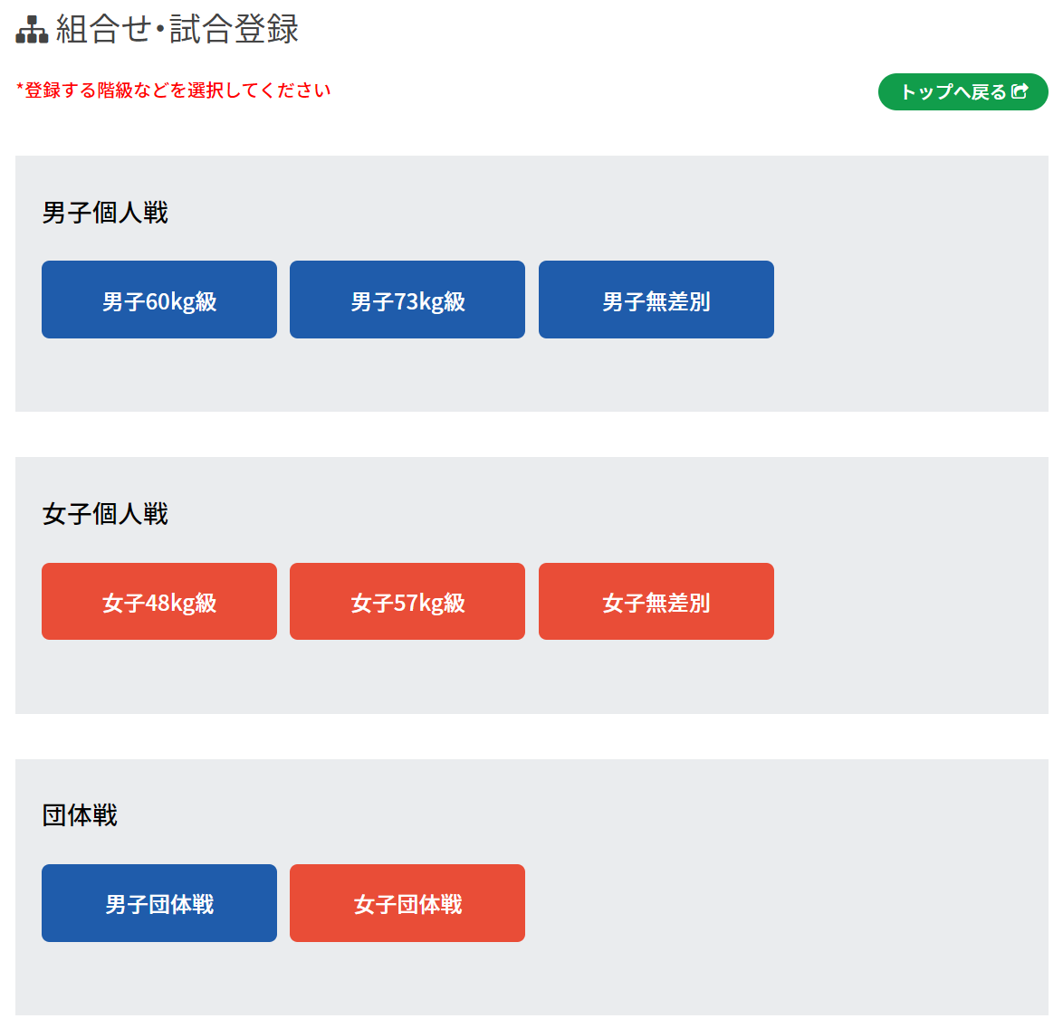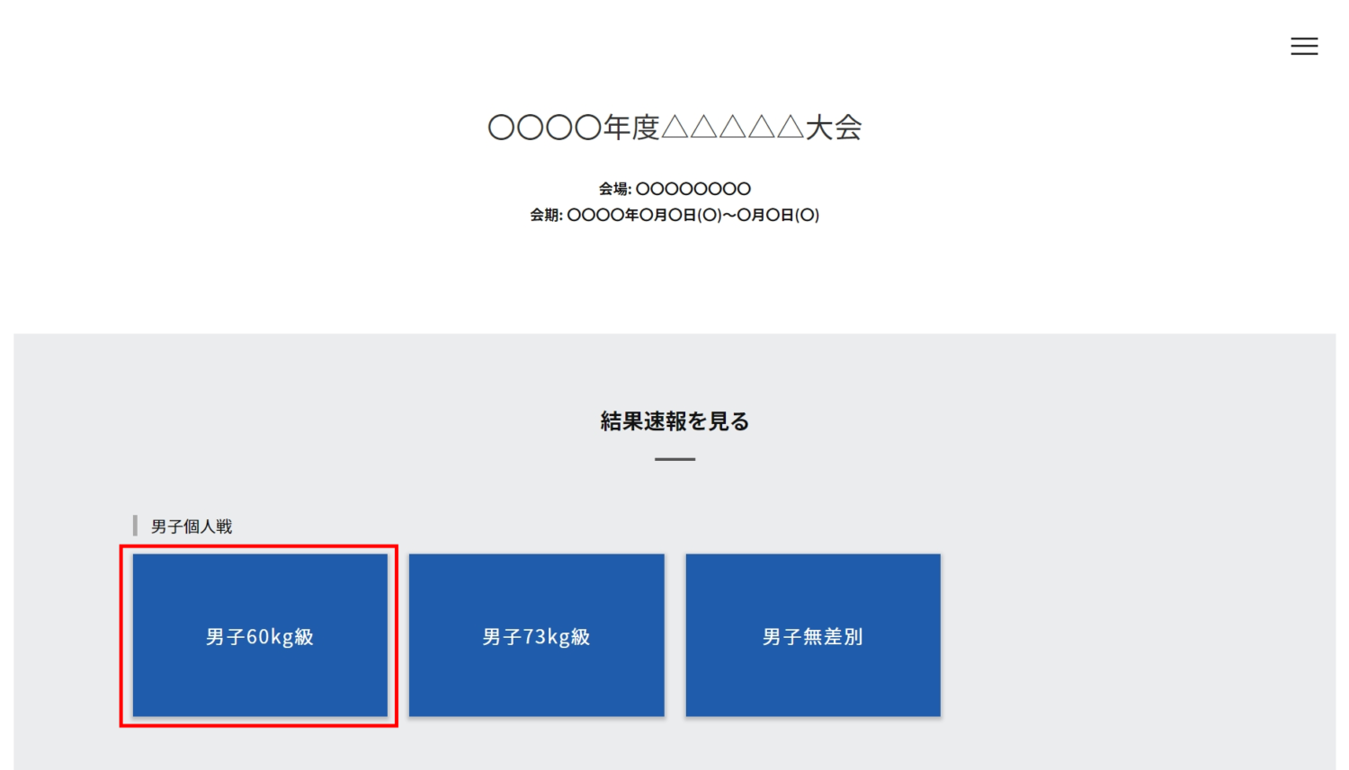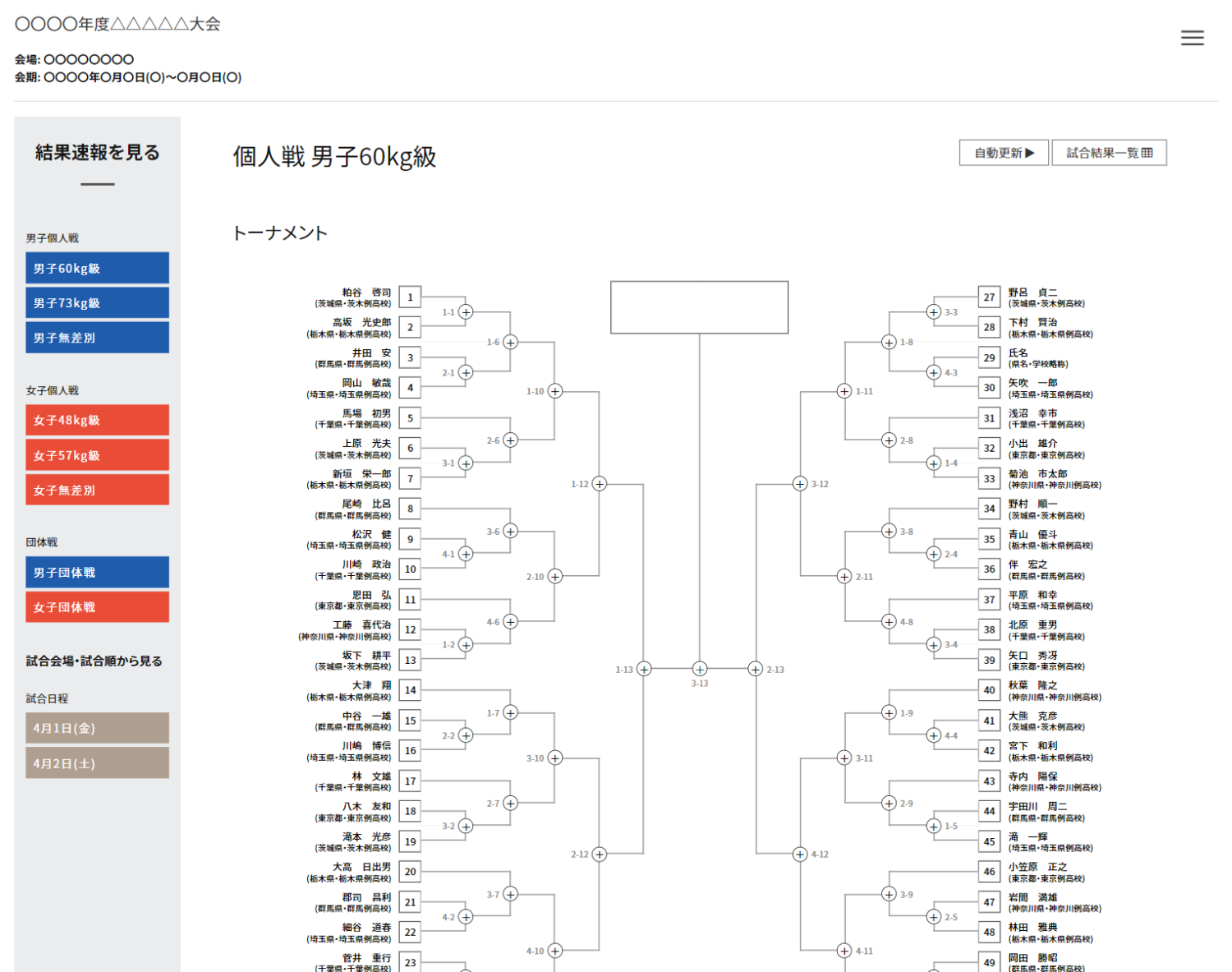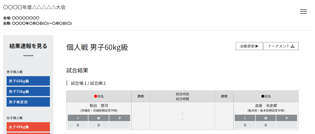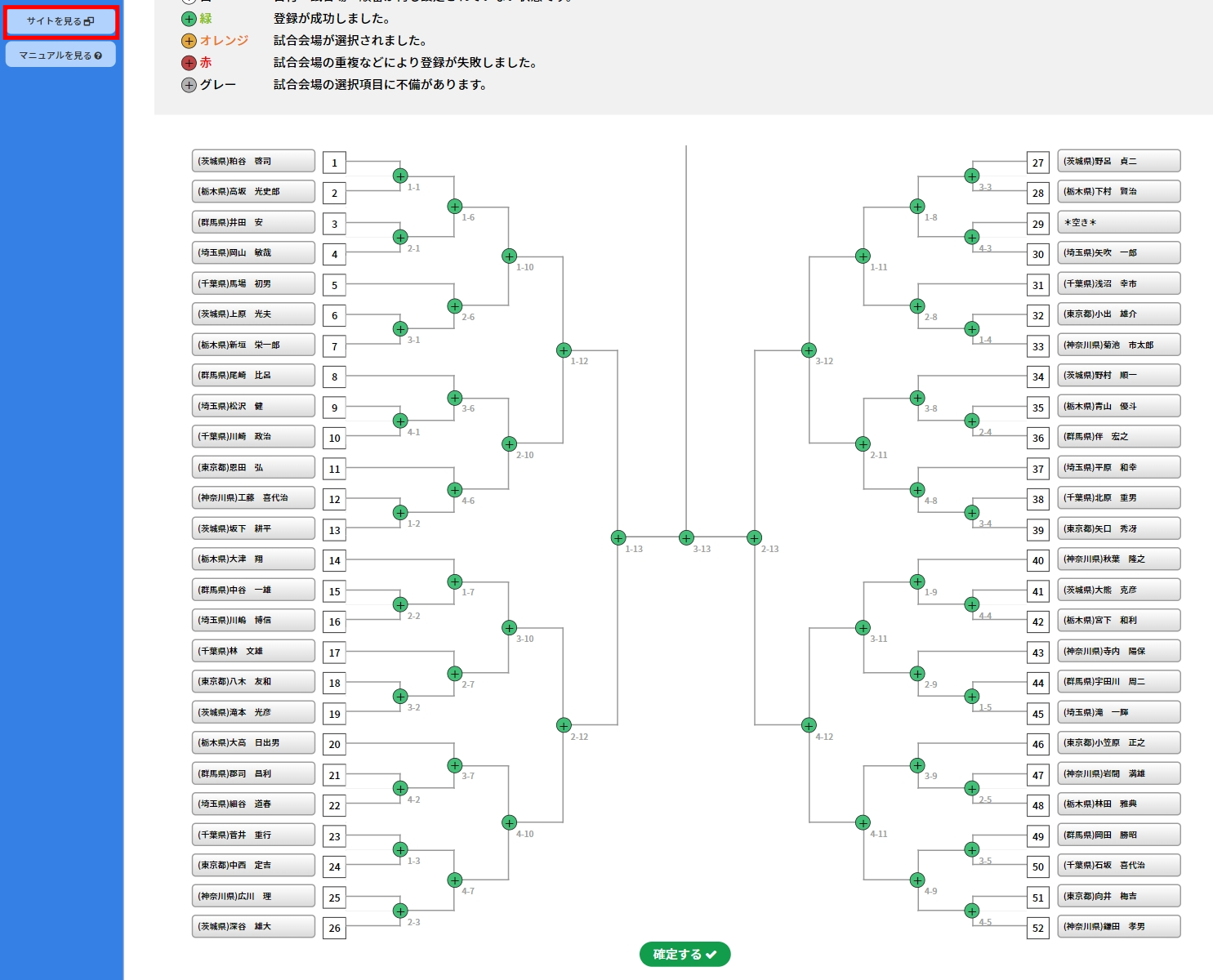 コントロールパネルの左サイドバーの「サイトを見る」ボタンを選択し、下図のようにサイトを表示し、該当の階級を選択していただくと、トーナメントが完成していることがわかります。