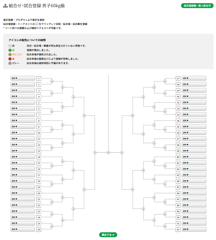 組合せ・試合登録の途中でも「確定する」ボタンを選択すると保存できます。