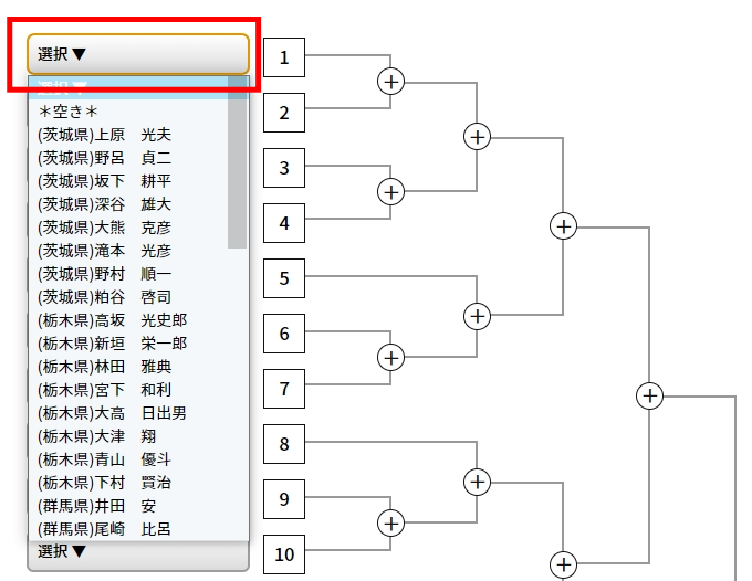 前項の「選手登録・管理」で登録した選手を、トーナメント表に割り当てていきます。