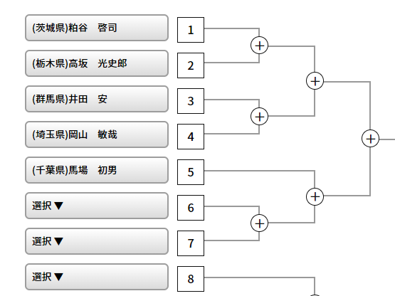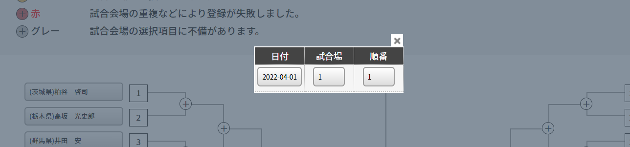 表示されたトーナメントに選手・日付/試合場/順番をそれぞれ設定していきます。