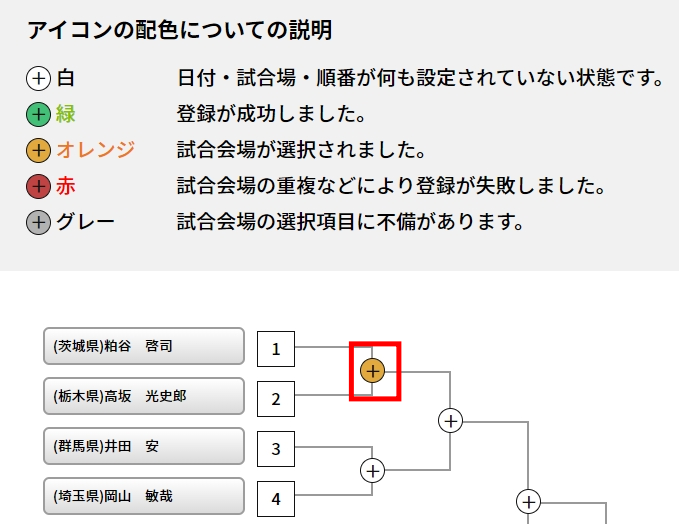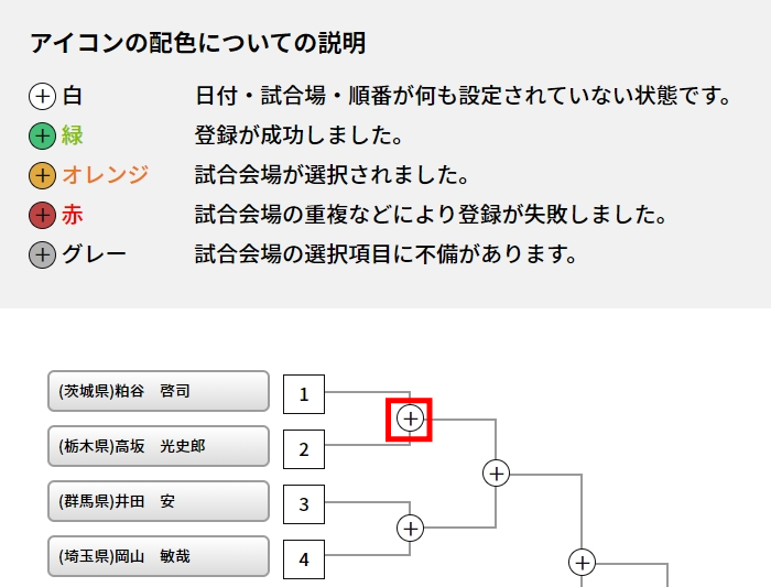 次に、以下のトーナメント上に配置されているプラスマークのところから、日付・試合場・順番を行います。