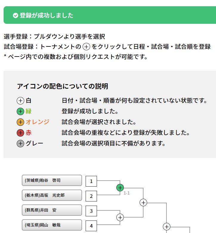 設定したプラスマークは、下図のように緑色に変わり「1-1 (試合場 – 順番)」の文字が表示され、登録が成功されたということがわかります。