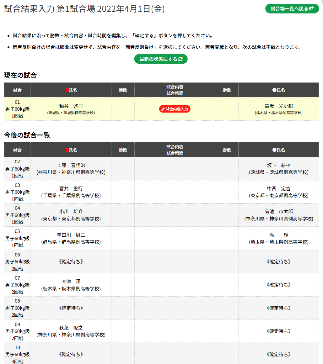 下図のように、現在の試合に「試合内容入力」のボタンが表示され、ここから試合内容を入力していきます。