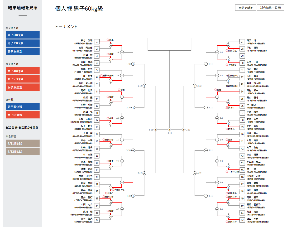 試合結果入力を進めて行くと同時に、下図のようにサイト上ではトーナメント表の勝ち上がりも反映されています。
