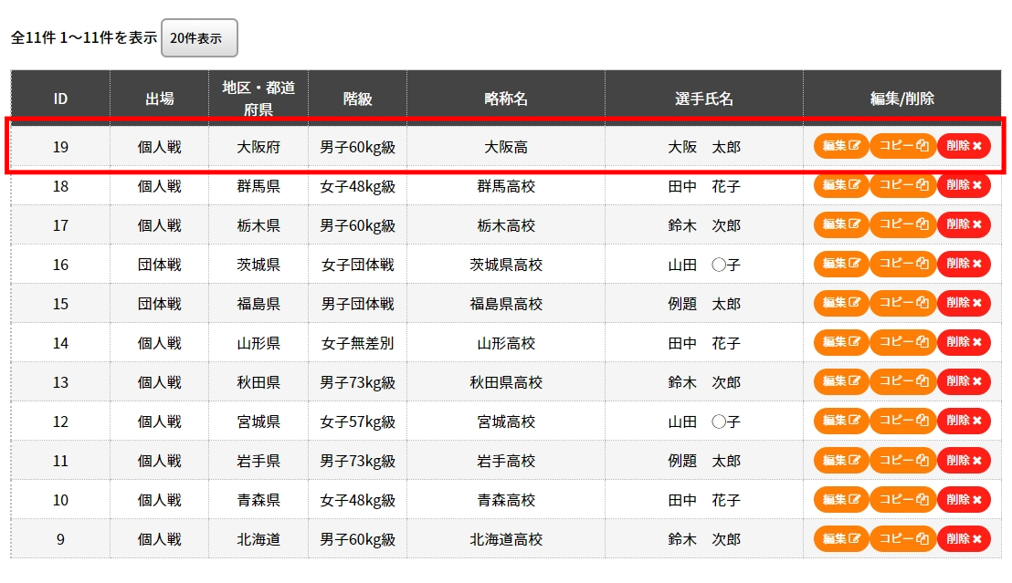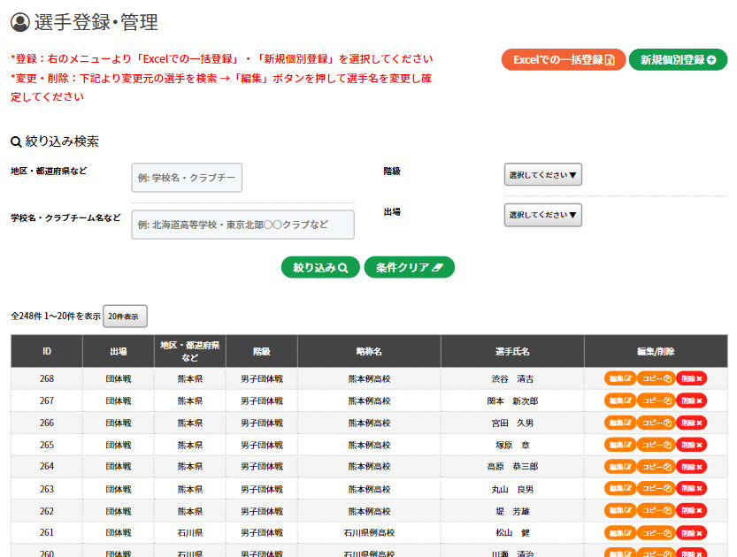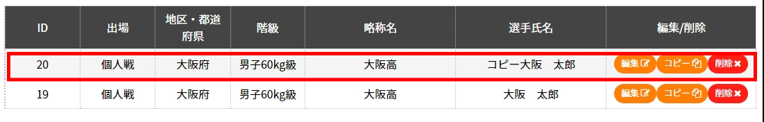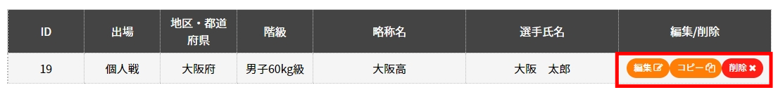 登録した選手は、「編集/削除」の列にあるボタンで、編集・コピー・削除ができます。