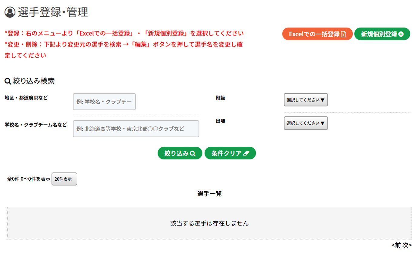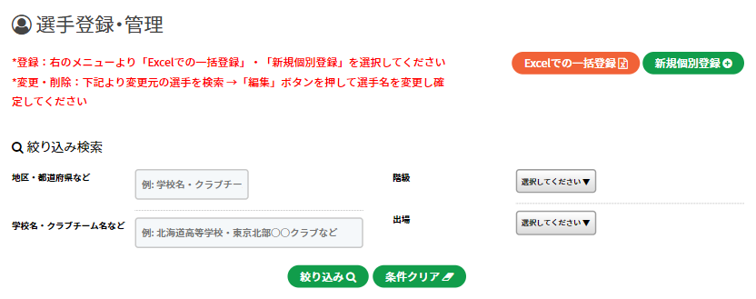 | 新規個別登録 | 選手を個別で入力し、一人ずつ登録することができます。 |
