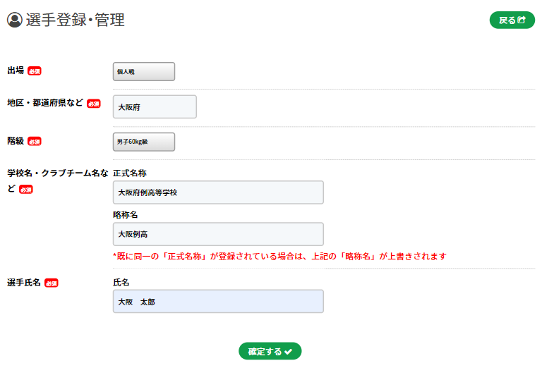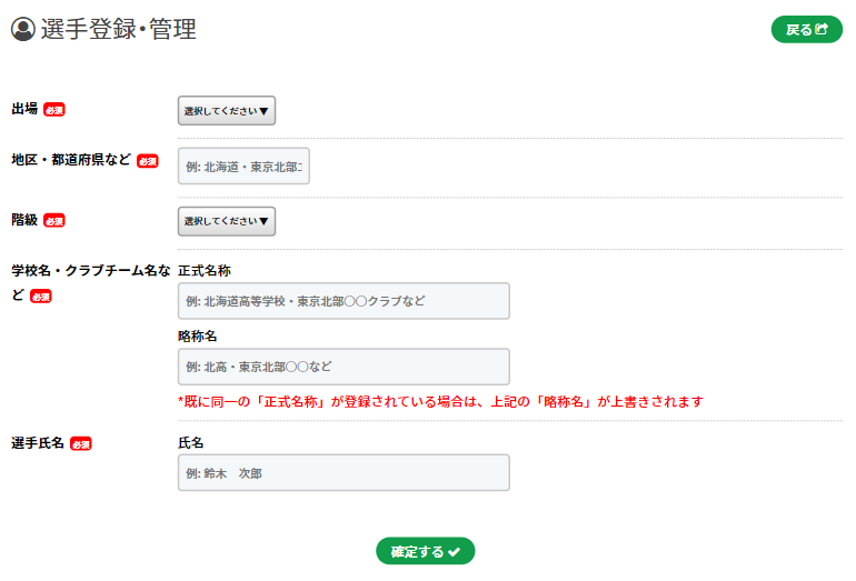プルダウンまたは入力欄に必要事項を入力のうえ、「確定する」ボタンを選択することで、下図のように選手リストに新たに登録されます。