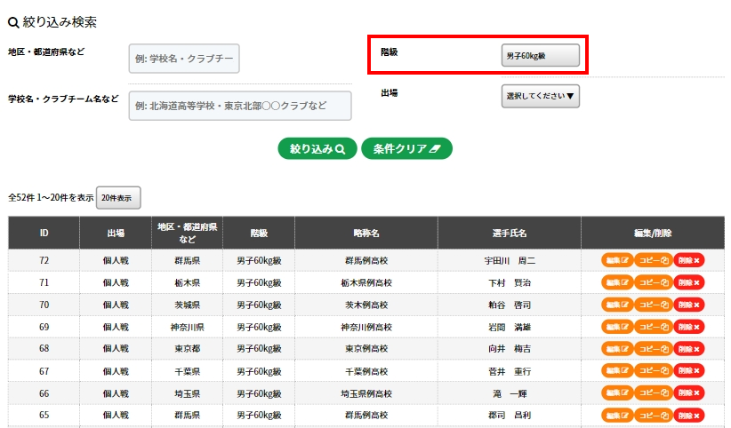 階級を「男子60kg」にして絞り込んだ場合、下図のように男子60kgのリストが表示されますなります。