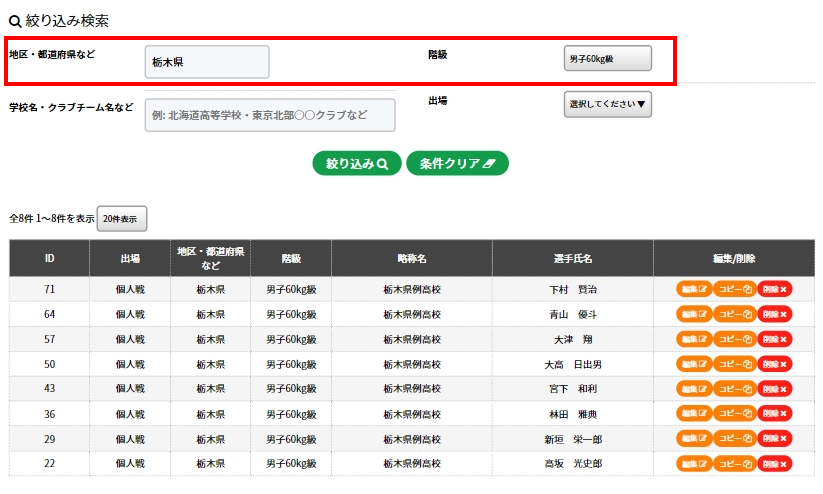 下図のように、地域・都道府県などを「栃木県」、階級を「男子60kg」にして絞り込み、複合的に検索することも可能です。