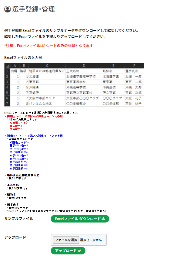 | Excelでの一括登録 | Excelファイルで作成した選手リストをアップロードし、一括での登録が可能です。 最初の選手登録作業は、こちらの方法をご利用ください。 |