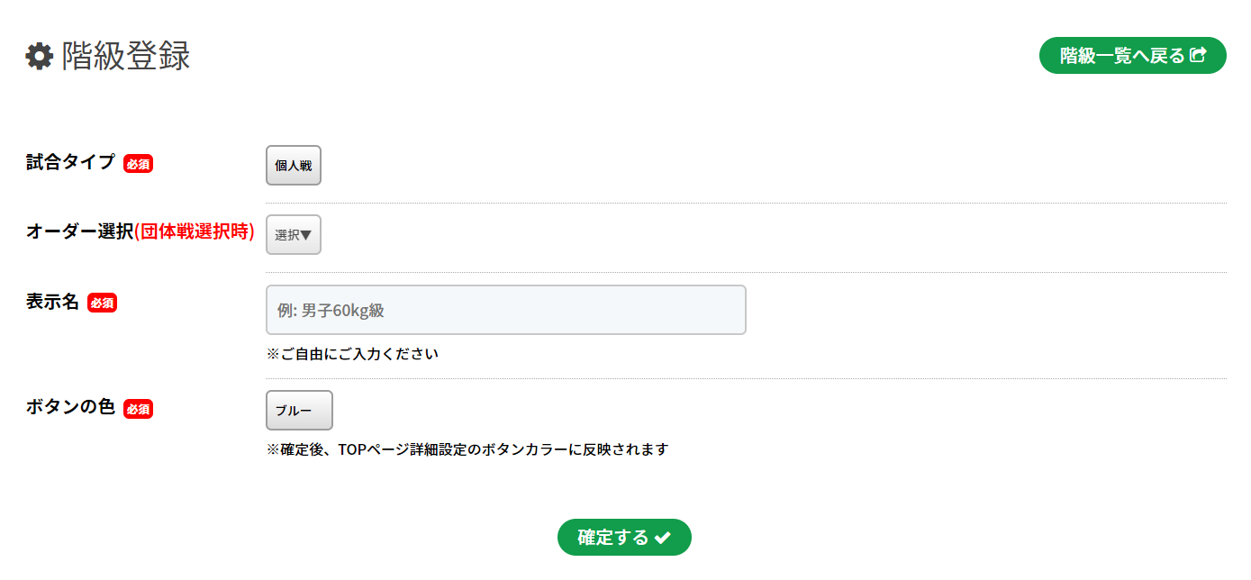 試合タイプ (必須)登録する階級が、「個人戦」「団体戦」なのかをプルダウンより選択します。
